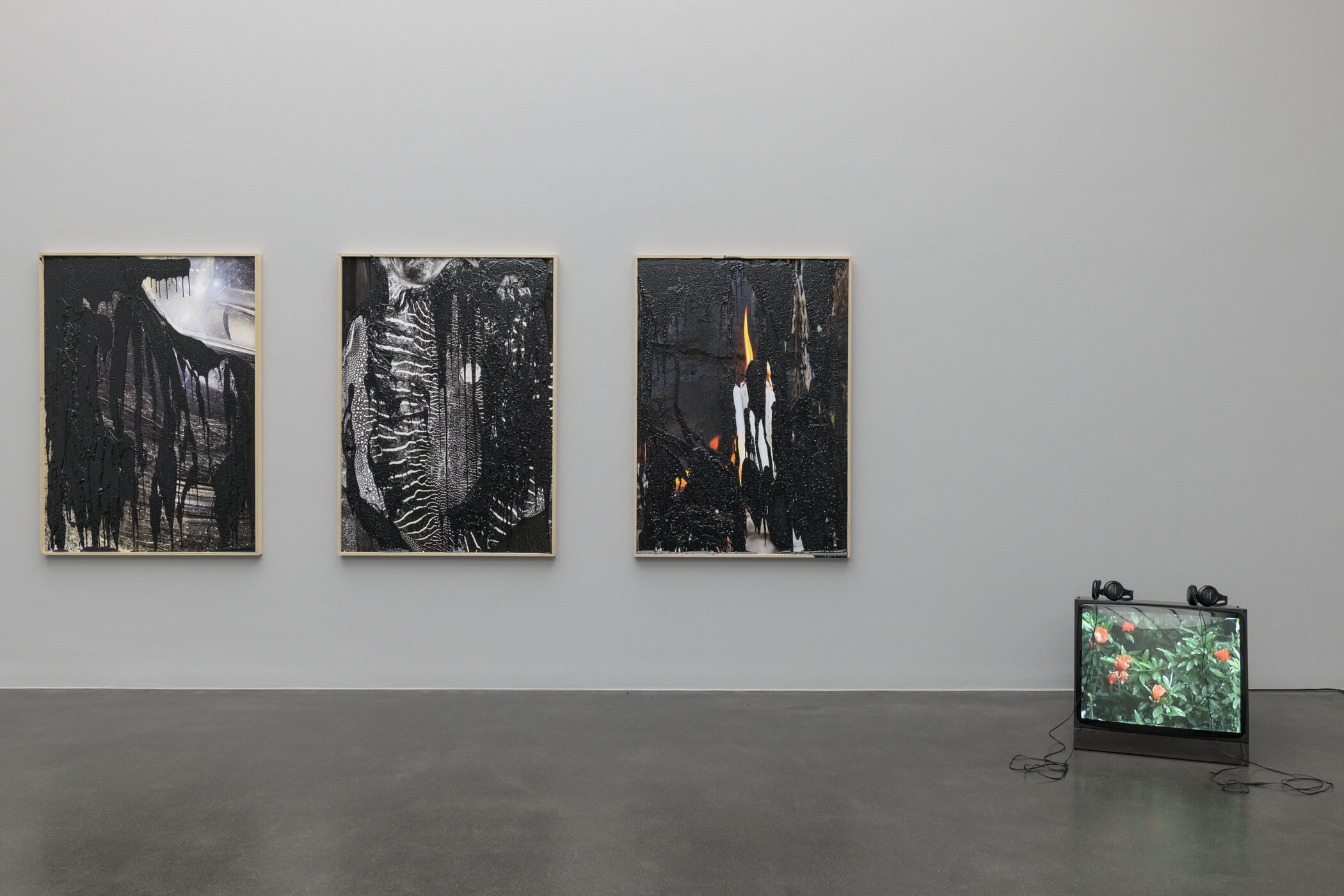 The point of departure for Xhaferaj’s works are her origin and her biography. In her installation A Pause, a Rose, Something on Paper which is presented during zentral! XL, the artist deals with censorship and suppression. Three photographs are covered in bitumen, a constituent of petroleum. The application is crude and also extends beyond the frame. The original image can only be surmised, for example, the candle in a religious ritual or the artist’s car after an accident. The video consists of photographs that Xhaferaj took as a child during family celebrations in Albania. She discovered later that her father had substituted the blurred parts with photographs of his favourite flowers, clearly an attempt to enhance his daughter’s work. The title is from a poem by the American poet Lyn Hejinian which deals, among other things, with memories of childhood. The different elements thus interweave to create a dialogue about memory, history and censorship.